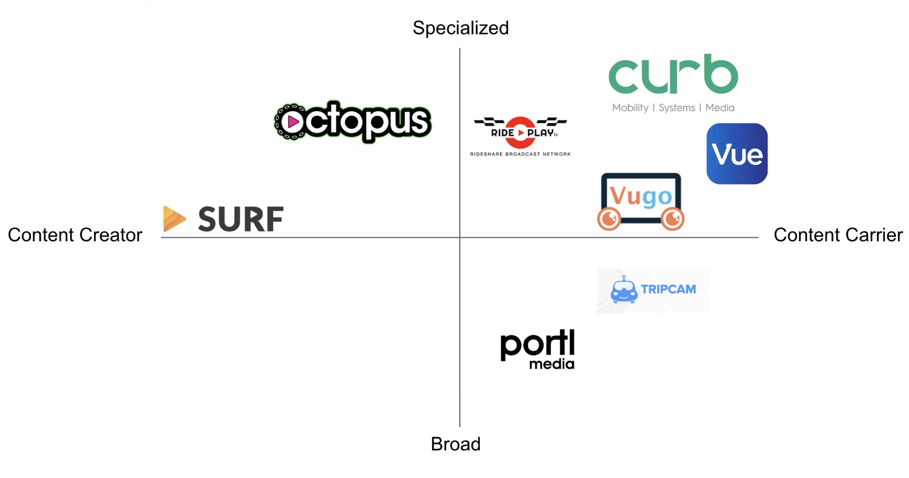 To better understand VueBox and the competitive space within rideshare entertainment providers we mapped them on a matrix to look for market gaps and opportunity areas. VueBox focuses on carrying content that already exist vs. being a content creator. This helped determine what type of content would be added to our redesign.