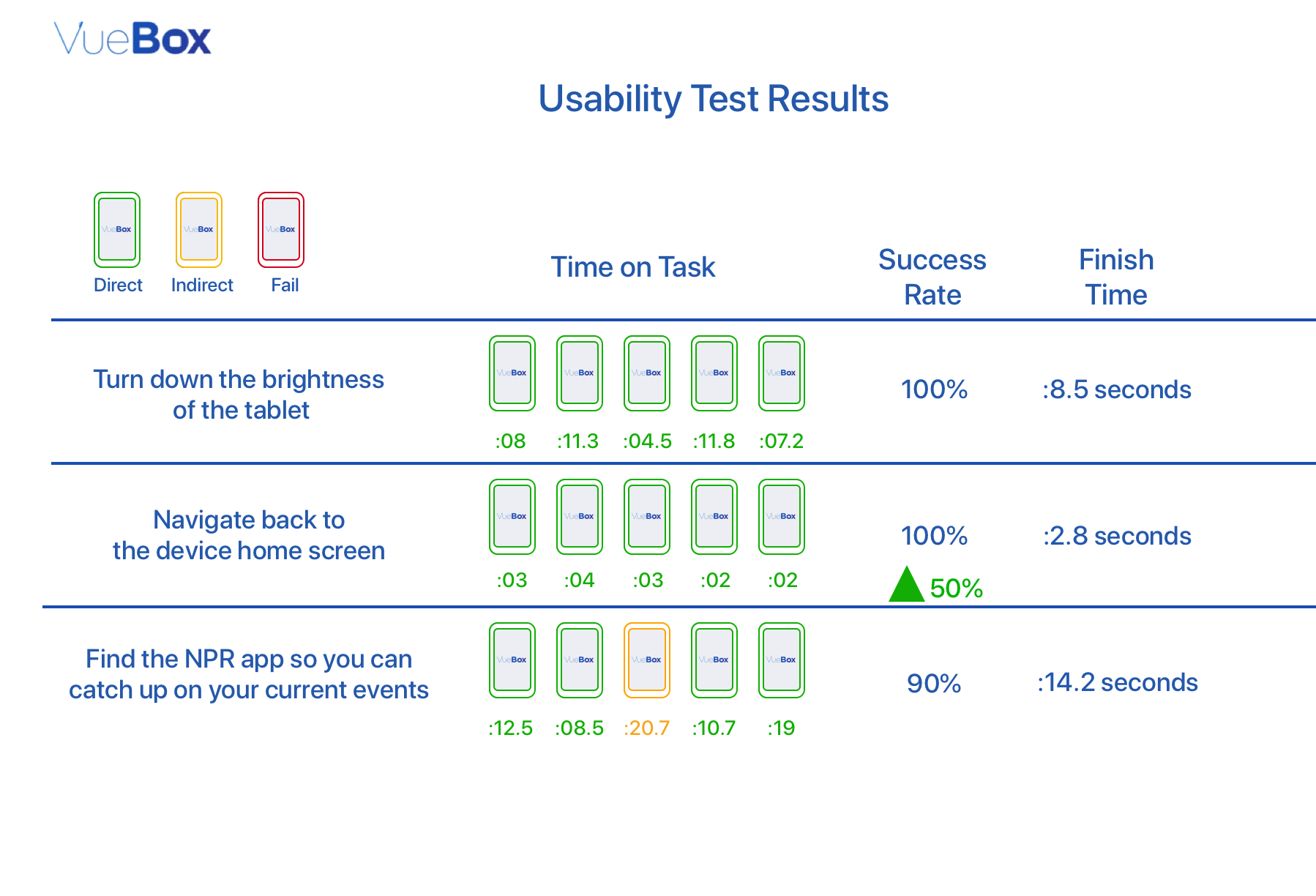 During the usability test we measured participants engagement with the tablet and for what length of time. At the end of the 10 minute test participants were asked to complete three tasks on the tablet. Users were assigned 3 tasks to complete.